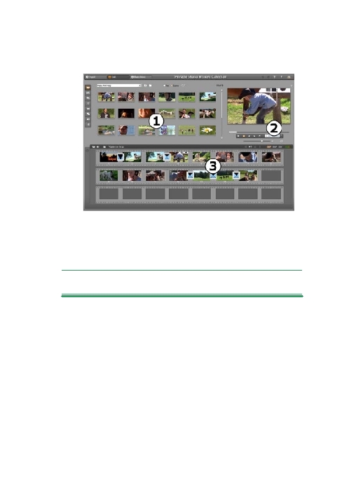 Pinnacle 14 terbuka dalam mode Edit setiap kali diluncurkan, karena itu adalah mode yang paling sering digunakan. Layar mode Edit mencakup tiga bidang utama.Album ini menyimpan sumber daya yang akan Anda gunakan di film Anda, termasuk file video Anda yang di capture atau anda simpan di file ini.