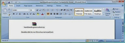 Dalam email tersebut juga mengatakan bahwa apabila file yang terlampir tersebut, terdeteksi oleh virus maka penguna di harpkan untuk mematikan, anti virus yang di gunakan, sementara waktu, Kampanye ini pada dasarnya mencoba setiap trik untuk menjalankan executable berbahaya yang tersembunyi di dalam file DOCX." File terlampir tersebut adalah file docx yang mungkin tampak lebih aman daripada file eksekusi k. Namun, setelah file docx dibuka pengguna disajikan dengan file zip yang dienkripsi. Setelah pengguna melakukan ekstrak file zip tersbut , mereka akan menemukan file berbahaya heartbleedbugremovaltool.exe di dalamnya, "jelas Symantec.